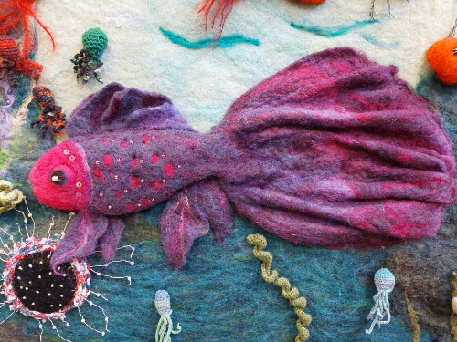 Wat ik zo leuk vindt aan vilten is dat je niet volgens een vast patroon hoeft te werken, maar de vrijheid hebt om lekker te experimenteren met kleur. Ook werk ik met andere vezels dan alleen wol zoals bijvoorbeeld zijde en hennep.